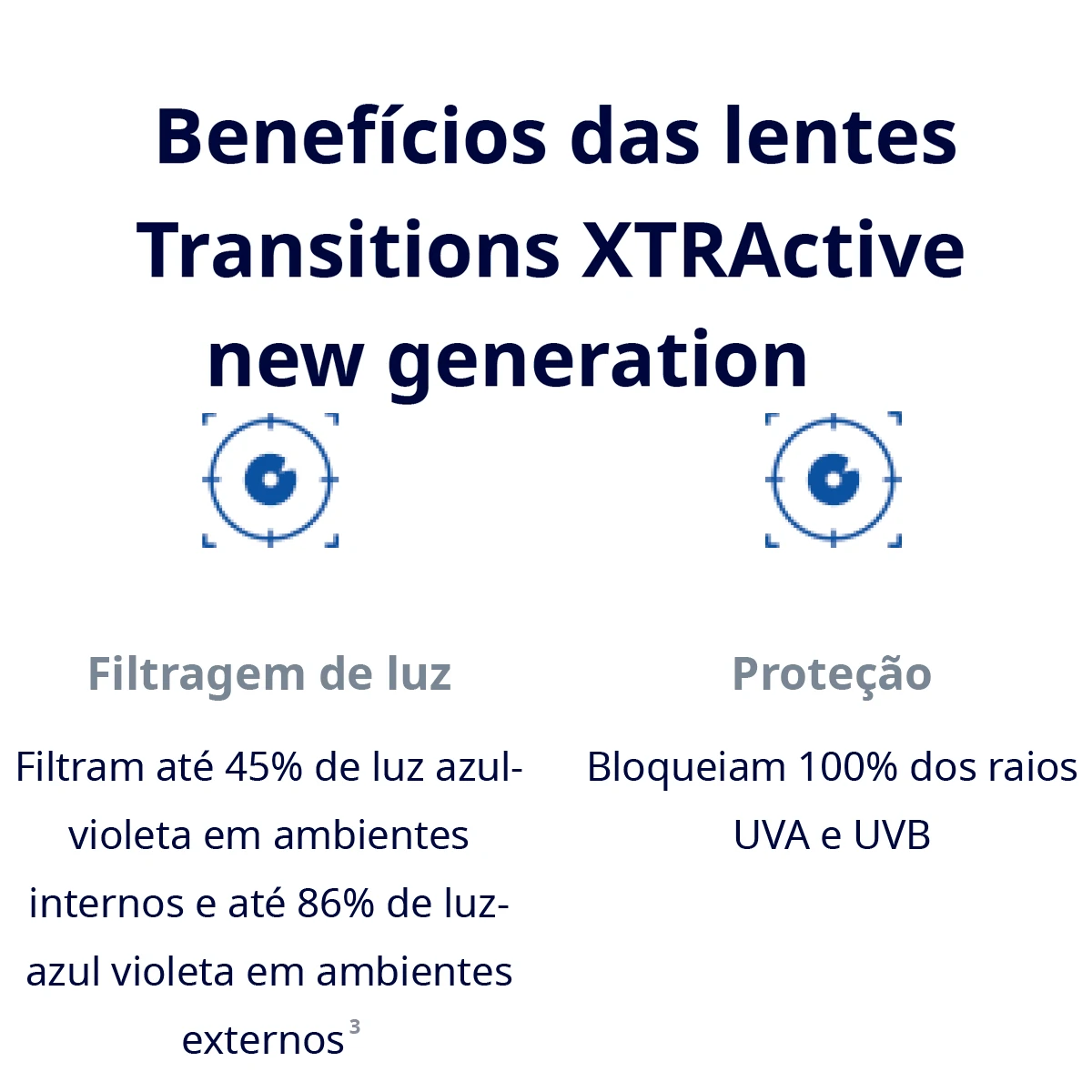 A linha de lentes Transitions XTRActive New Generation é uma delas, que garante alto desempenho para quem sofre com a luz. Se você é muito sensível à luz ou frequentemente exposto à luz intensa, as lentes Transitions® XTRActive® New Generation são perfeitas para você.