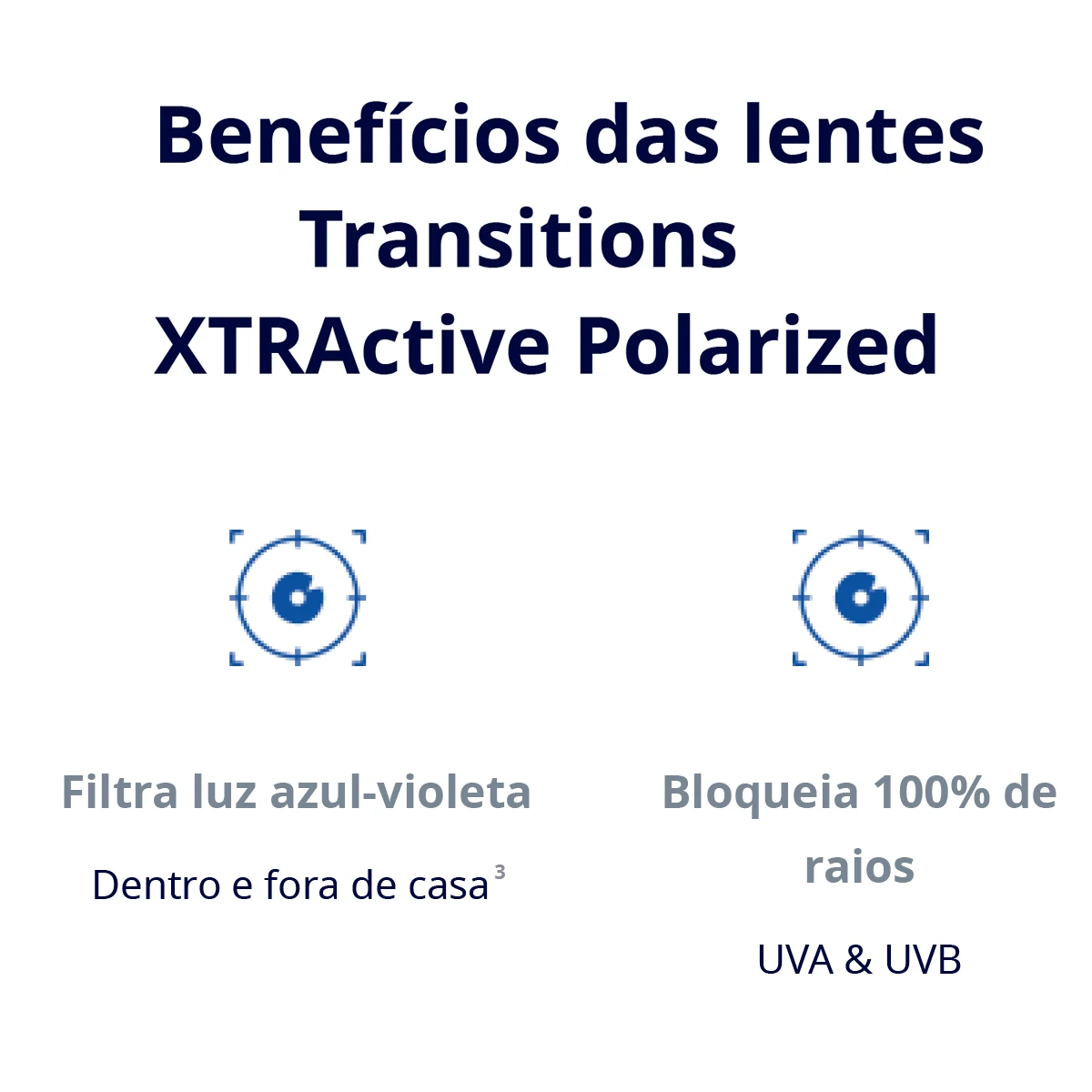 A linha de lentes Transitions XTRActive Polarizad é uma delas, que garante alto desempenho para quem sofre com a claridade. Se você alguma vez encontrar luz solar brilhante, ou brilho refletido em superfícies como estradas ou água, as lentes Transitions® XTRActive® Polarized™ são projetadas exclusivamente para você.